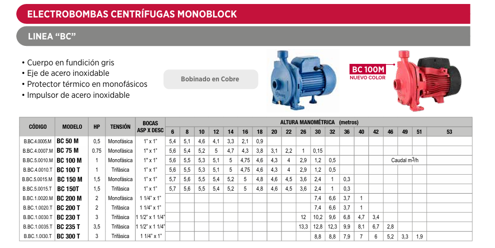 La línea de electrobombas centrífugas monoblock “BC”, está diseñada para el bombeo de agua limpia para elevación a tanques cisternas, en sistemas de presurización y en riegos.