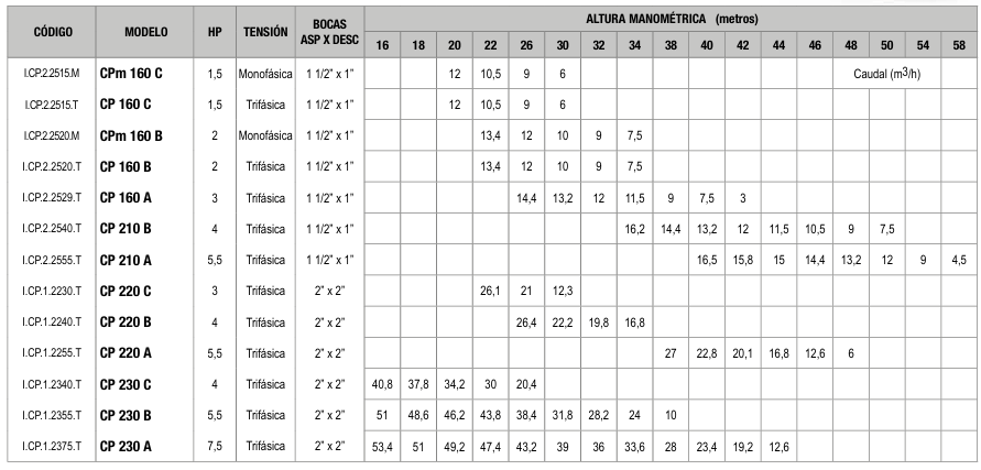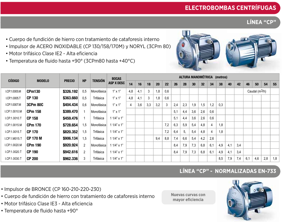 La línea de electrobombas centrífugas monoblock "CP" está diseñada para el bombeo de agua limpia sin partículas en suspensión y líquidos químicamente no agresivos. Por su variedad de modelos y prestaciones hidráulicas pueden ser utilizadas en instalaciones domésticas, civiles e industriales. Ideales para trabajos de elevación y riego. Son aptas para el abastecimiento de agua en sistemas de enfriamiento y contra incendio; acopladas a tanques hidroneumáticos pueden ser utilizadas para presurización en suministro de agua domiciliaria.