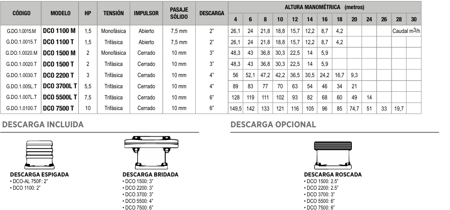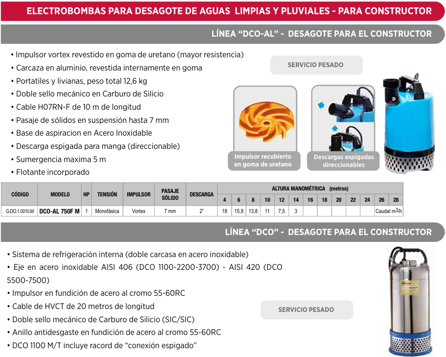 Las Electrobombas para Desagote “DCO” brindan una óptima prestación hidráulica en el bombeo de aguas sucias o cargadas con sólidos en suspensión. Son aptas para el bombeo en obras civiles, movimiento de líquidos, alcantarillado, bocas de tormenta, sumideros, etc, sumergiéndola directamente en el lugar a desagotar.